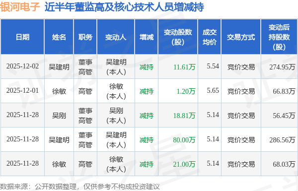 银河电子近半年内的董监高及核心技术人员增减持详情如下: