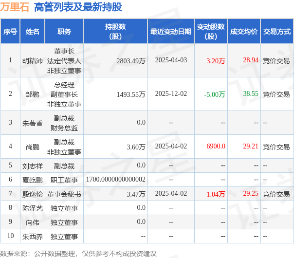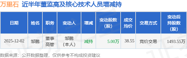 证券之星消息,根据12月3日市场公开信息、上市公司公告及交易所披露数据整理,万里石(002785)最新董监高及相关人员股份变动情况:2025年12月2日公司董事,高管邹鹏共减持公司股份5.0万股,占公司总股本为0.0221%。变动期间公司股价上涨4.76%,12月2日当日收盘报38.55元。