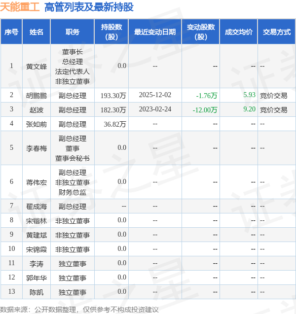 天能重工的高管列表及最新持股情况如下: