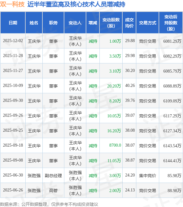 双一科技近半年内的董监高及核心技术人员增减持详情如下:
