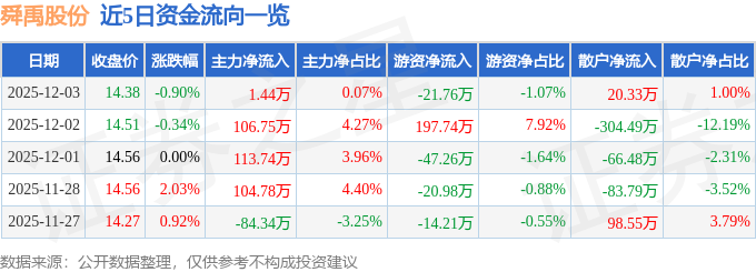 证券之星消息,截至2025年12月3日收盘,舜禹股份(301519)报收于14.38元,下跌0.9%,换手率1.81%,成交量1.41万手,成交额2027.64万元。