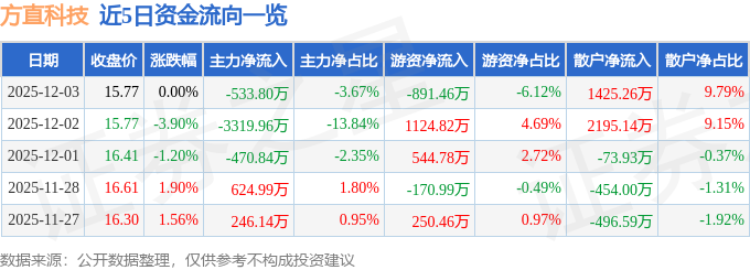 证券之星消息,截至2025年12月3日收盘,方直科技(300235)报收于15.77元,上涨0.0%,换手率4.57%,成交量9.29万手,成交额1.46亿元。