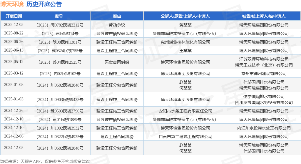 案号:(2025)闽0782民初2212号根据统计,近一年内以博天环境集团股份有限公司为当事人的历史开庭公告有13则,其中案由为“建设工程施工合同纠纷”的公告以6则居首,其次为“建设工程分包合同纠纷”有2则,“普通破产债权确认纠纷”有2则。历史开庭公告如下:
