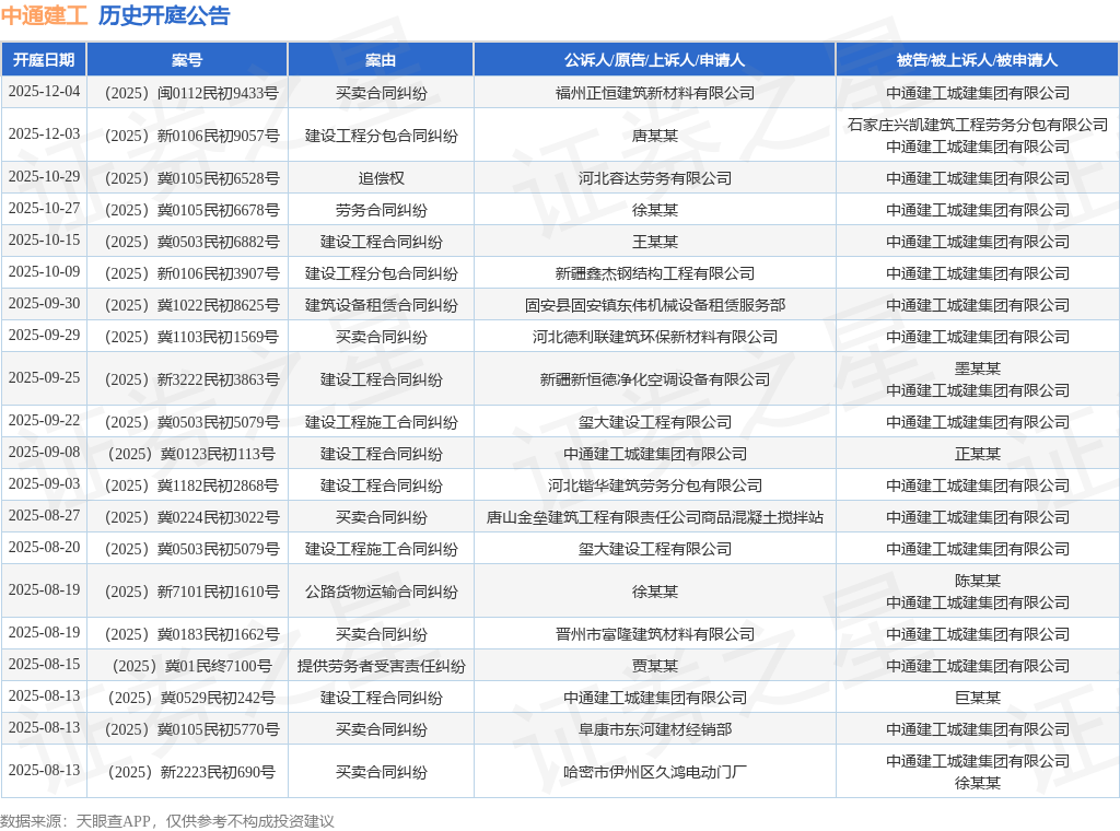案号:(2025)闽0112民初9433号根据统计,近一年内以中通建工城建集团有限公司为当事人的历史开庭公告有82则,其中案由为“买卖合同纠纷”的公告以25则居首,其次为“建设工程合同纠纷”有23则,“劳务合同纠纷”有7则。历史开庭公告(前20条)如下: