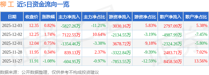 证券之星消息,截至2025年12月3日收盘,柳 工(000528)报收于12.35元,上涨0.82%,换手率2.07%,成交量42.08万手,成交额5.2亿元。