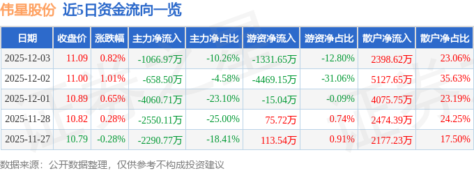证券之星消息,截至2025年12月3日收盘,伟星股份(002003)报收于11.09元,上涨0.82%,换手率0.93%,成交量9.41万手,成交额1.04亿元。