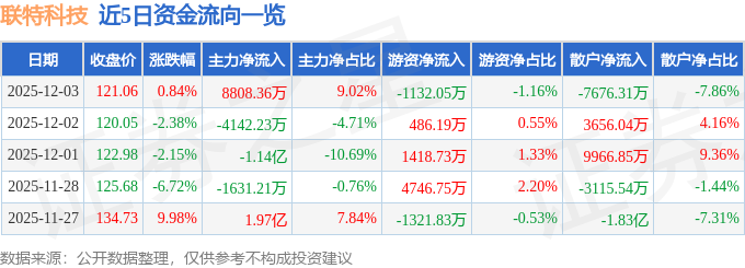 证券之星消息,截至2025年12月3日收盘,联特科技(301205)报收于121.06元,上涨0.84%,换手率11.81%,成交量8.03万手,成交额9.76亿元。