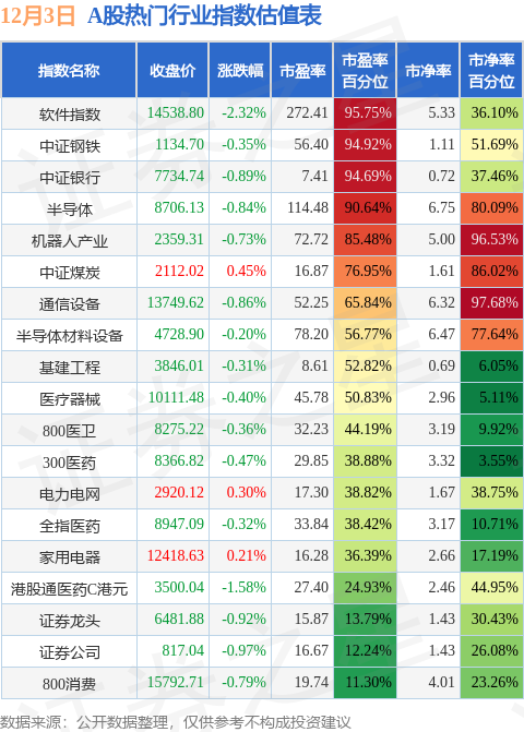 热门行业指数方面,软件指数的市盈率百分位较高,为95.75%。而800消费的市盈率百分位较低,为11.3%。