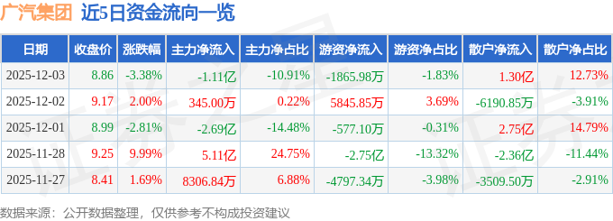证券之星消息,截至2025年12月3日收盘,广汽集团(601238)报收于8.86元,下跌3.38%,换手率1.54%,成交量114.08万手,成交额10.21亿元。