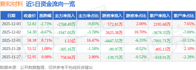 证券之星消息,截至2025年12月3日收盘,聚和材料(688503)报收于52.82元,下跌2.73%,换手率3.0%,成交量5.42万手,成交额2.87亿元。