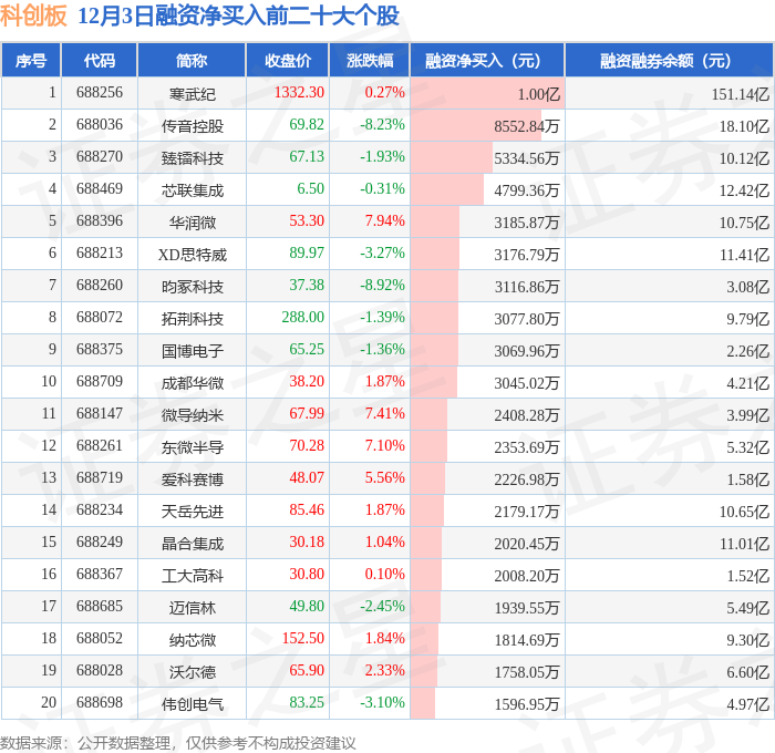 科创板融资净买入前三分别为:寒武纪(688256)融资净买入1亿元、传音控股(688036)融资净买入8552.84万元、臻镭科技(688270)融资净买入5334.56万元,前20具体见下表:
