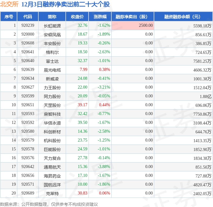 北交所融券净卖出前三分别为:长虹能源(920239)融券净卖出2500股,前20具体见下表: