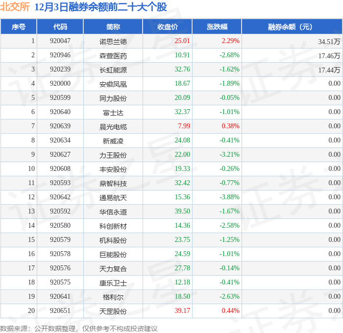 北交所融券余额前三分别为:诺思兰德(920047)融券余额34.51万元、森萱医药(920946)融券余额17.46万元、长虹能源(920239)融券余额17.44万元,前20具体见下表: