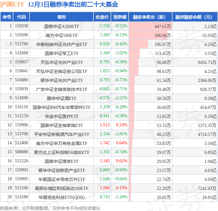 沪深ETF融券净卖出前三分别为:国泰中证A500ETF(159338)融券净卖出447.61万股、南方中证500ETF(510500)融券净卖出396.06万股、华泰柏瑞中证光伏产业ETF(515790)融券净卖出196.97万股,前20具体见下表: