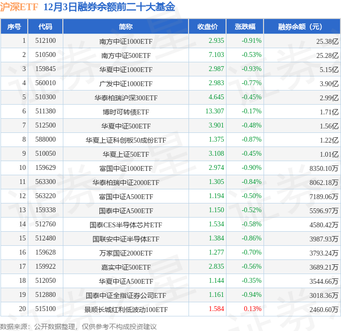 沪深ETF融券余额前三分别为:南方中证1000ETF(512100)融券余额25.38亿元、南方中证500ETF(510500)融券余额25.28亿元、华夏中证1000ETF(159845)融券余额5.15亿元,前20具体见下表: