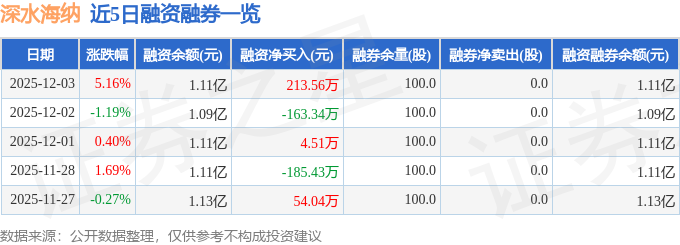 深水海纳融资融券信息显示,融资方面,当日融资买入835.91万元,融资偿还622.35万元,融资净买入213.56万元。融券方面,融券卖出0.0股,融券偿还0.0股,融券余量100.0股,融券余额0.16万元。融资融券余额1.11亿元。