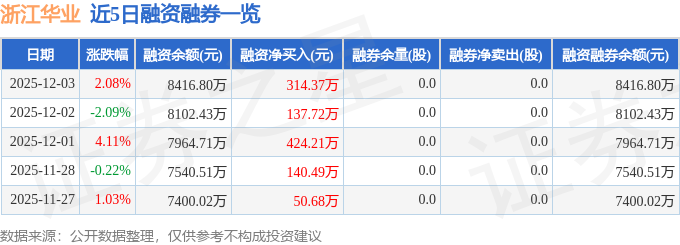 浙江华业融资融券信息显示,融资方面,当日融资买入992.52万元,融资偿还678.14万元,融资净买入314.37万元,连续3日净买入累计876.3万元。融券方面,融券卖出0.0股,融券偿还0.0股,融券余量0.0股,融券余额0.0万元。融资融券余额8416.8万元。