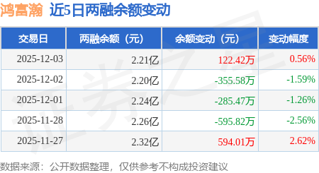 证券之星消息,12月3日,鸿富瀚(301086)融资买入1564.37万元,融资偿还1441.96万元,融资净买入122.42万元,融资余额2.21亿元,近20个交易日中有11个交易日出现融资净买入。