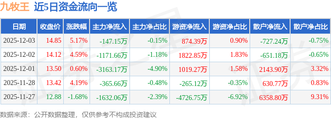 12月3日的资金流向数据方面,主力资金净流出147.15万元,占总成交额0.15%,游资资金净流入874.39万元,占总成交额0.9%,散户资金净流出727.24万元,占总成交额0.75%。