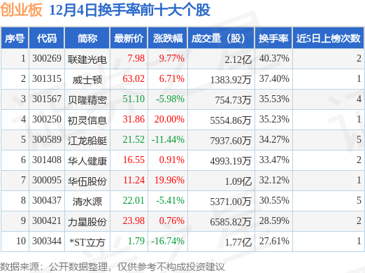 当日创业板换手率前10大个股中6只个股收涨,平均涨幅9.69%,其中联建光电(300269)以换手率40.37%排第一,6只个股近5个交易日中多次上榜。