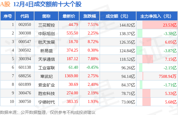 当日A股成交额前10大个股中9只个股收涨,平均涨幅3.99%,其中三花智控(002050)以成交额144.82亿元排第一。从主力资金流入看,成交额前10大个股中有6只个股呈现主力资金净流入。