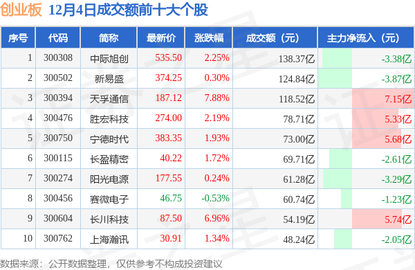 当日创业板成交额前10大个股中9只个股收涨,平均涨幅2.76%,其中中际旭创(300308)以成交额138.37亿元排第一。从主力资金流入看,成交额前10大个股中有4只个股呈现主力资金净流入。