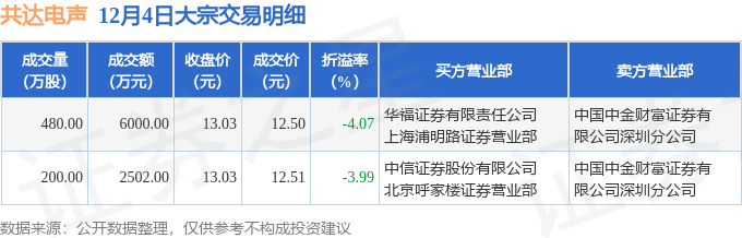 证券之星消息,12月4日共达电声发生大宗交易,交易数据如下: