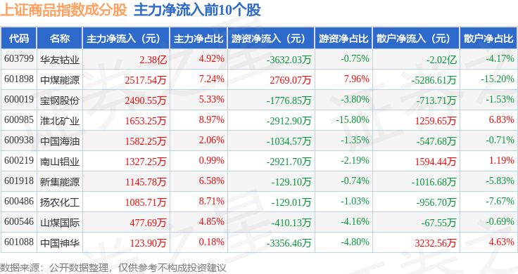 资金流向方面,上证商品(000066)指数成份股当日主力资金净流出合计19.4亿元,游资资金净流入合计6.87亿元,散户资金净流入合计12.52亿元。成份股资金流向详情见下表: