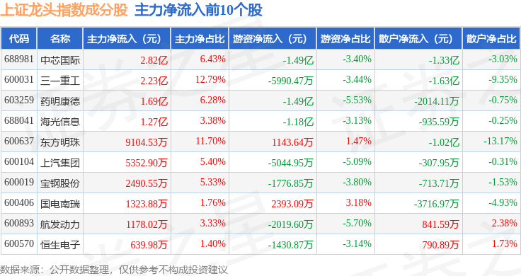 资金流向方面,上证龙头(000065)指数成份股当日主力资金净流出合计39.03亿元,游资资金净流入合计10.85亿元,散户资金净流入合计28.18亿元。成份股资金流向详情见下表: