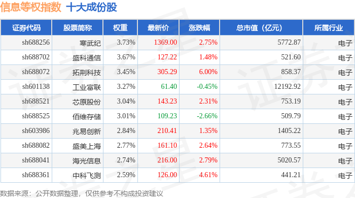 证券之星消息,12月4日,信息等权(000077)指数报收于5835.57点,涨0.97%,成交769.45亿元,换手率1.39%。当日该指数成份股中,上涨的有33家,拓荆科技以6.0%的涨幅领涨,下跌的有16家,佰维存储以2.66%的跌幅领跌。