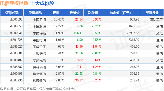 电信等权(000078)指数十大成份股详情如下:
