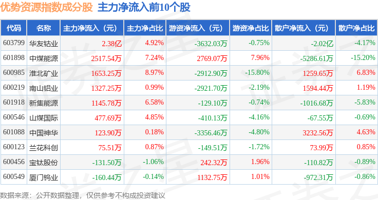资金流向方面,优势资源(000145)指数成份股当日主力资金净流出合计15.8亿元,游资资金净流入合计6.7亿元,散户资金净流入合计9.1亿元。成份股资金流向详情见下表: