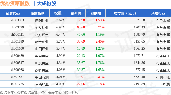 优势资源(000145)指数十大成份股详情如下:
