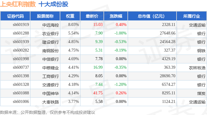 上央红利(000152)指数十大成份股详情如下: