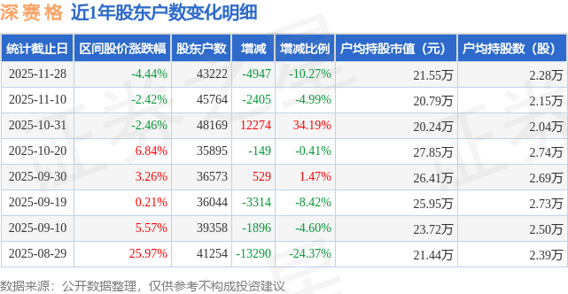 从股价来看,2025年10月31日至2025年11月28日,深 赛 格区间跌幅为4.44%,在此期间股东户数减少4947.0户,减幅为10.27%。