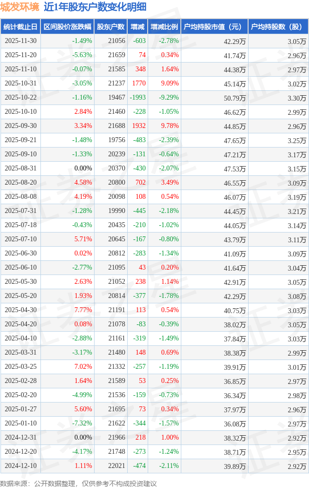 从股价来看,2025年11月20日至2025年11月30日,城发环境区间跌幅为1.49%,在此期间股东户数减少603.0户,减幅为2.78%。