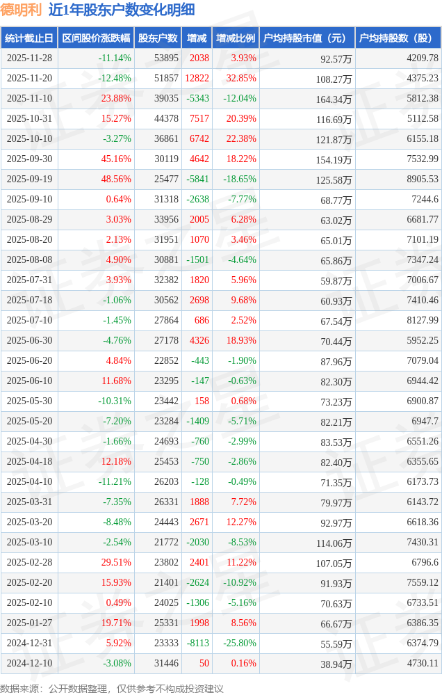 从股价来看,2025年11月20日至2025年11月28日,德明利区间跌幅为11.14%,在此期间股东户数增加2038.0户,增幅为3.93%。