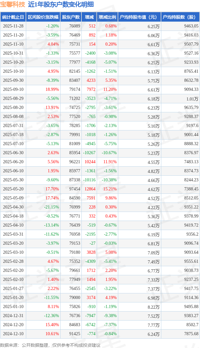 从股价来看,2025年10月31日至2025年11月28日,宝馨科技区间跌幅为1.2%,在此期间股东户数增加512.0户,增幅为0.68%。