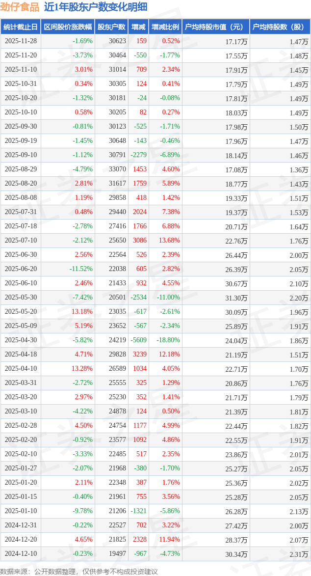 从股价来看,2025年11月20日至2025年11月28日,劲仔食品区间跌幅为1.69%,在此期间股东户数增加159.0户,增幅为0.52%。