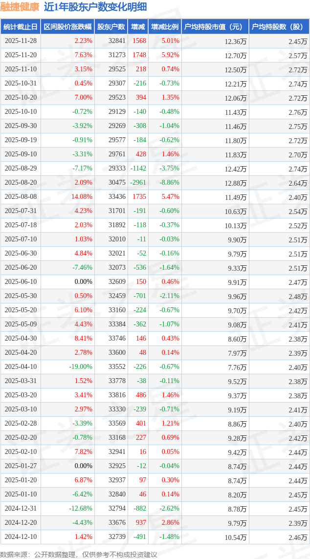 从股价来看,2025年11月20日至2025年11月28日,融捷健康区间涨幅为2.23%,在此期间股东户数增加1568.0户,增幅为5.01%。