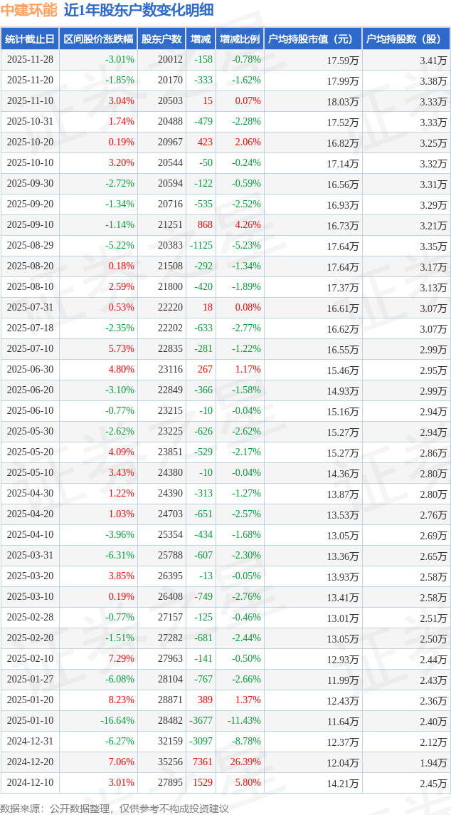 从股价来看,2025年11月20日至2025年11月28日,中建环能区间跌幅为3.01%,在此期间股东户数减少158.0户,减幅为0.78%。