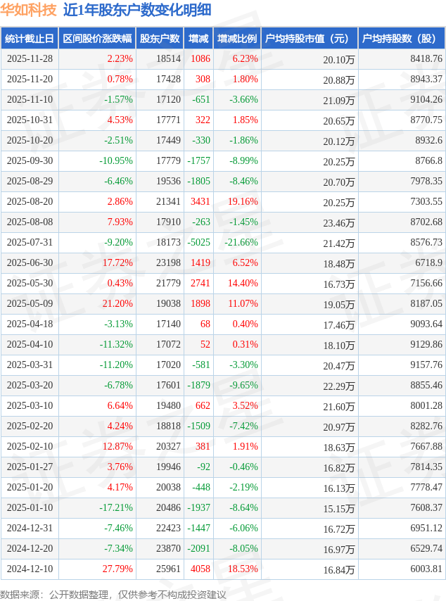 从股价来看,2025年11月20日至2025年11月28日,华如科技区间涨幅为2.23%,在此期间股东户数增加1086.0户,增幅为6.23%。