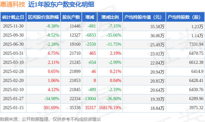 从股价来看,2025年9月30日至2025年11月30日,惠通科技区间跌幅为8.38%,在此期间股东户数减少881.0户,减幅为7.15%。