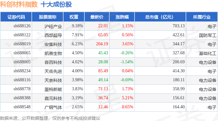 科创材料(000689)指数十大成份股详情如下: