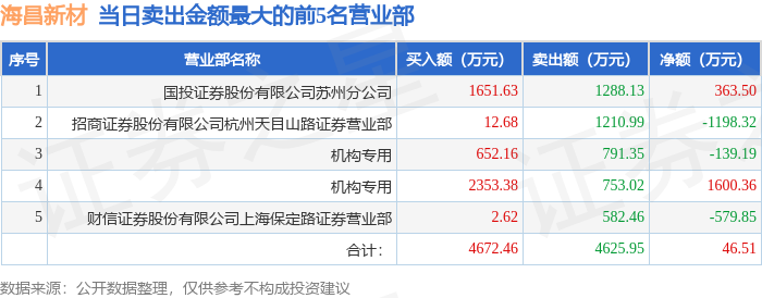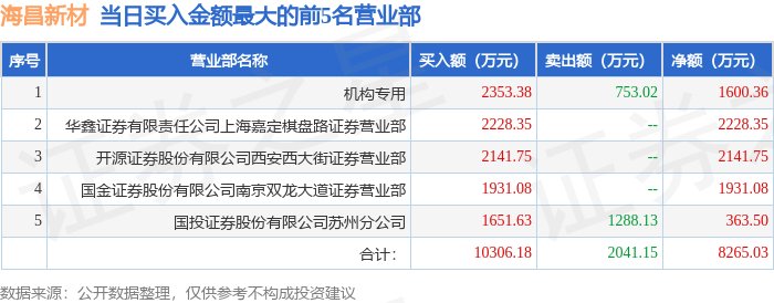 证券之星消息,沪深交易所2025年12月4日公布的交易公开信息显示,海昌新材(300885)因日涨幅达到15%的前5只证券登上龙虎榜。此次是近5个交易日内第1次上榜。