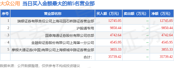 证券之星消息,沪深交易所2025年12月4日公布的交易公开信息显示,大众公用(600635)因有价格涨跌幅限制的日收盘价格涨幅偏离值达到7%的前五只证券登上龙虎榜。此次是近5个交易日内第1次上榜。