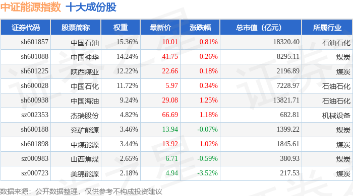中证能源(000928)指数十大成份股详情如下:
