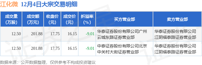 证券之星消息,12月4日江化微发生大宗交易,交易数据如下: