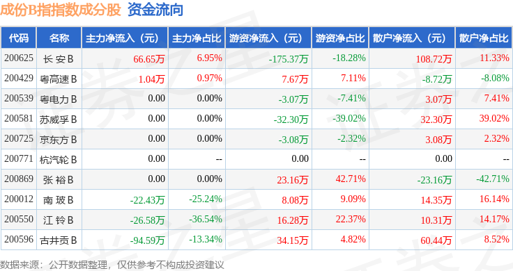 资金流向方面,成份B指(399003)指数成份股当日主力资金净流出合计75.91万元,游资资金净流出合计124.47万元,散户资金净流入合计200.38万元。成份股资金流向详情见下表: