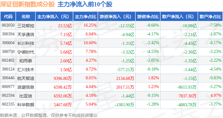 资金流向方面,深证创新(399016)指数成份股当日主力资金净流入合计15.07亿元,游资资金净流出合计20.27亿元,散户资金净流入合计5.2亿元。成份股资金流向详情见下表: